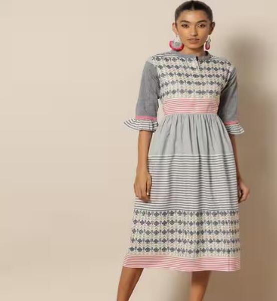Striped South Cotton Fit &Amp; Flare Dress With Mandarin Collar -- 1799.00