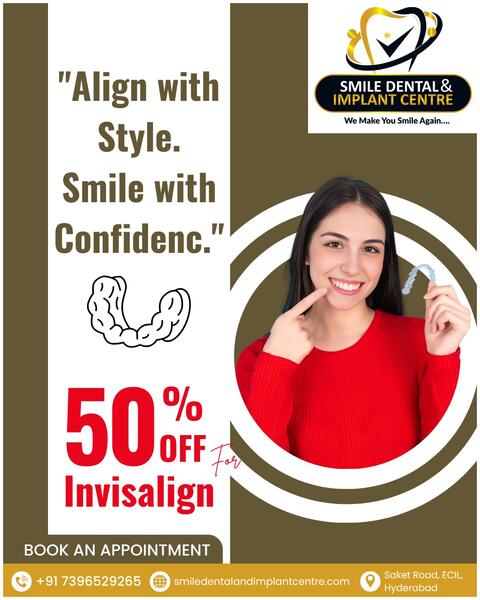 message pilisudhakar about this ad Discover a new level of personal style and radiant confidence. Achieve the smile you have always dreamed of with Invisalign. For a limited time, you can save up to 50% on transformative Invisalign treatments. This incredible offer makes achieving a perfect smile more accessible than ever. Invisalign offers a discreet and effective way to straighten your teeth. Unlike traditional braces with visible wires and brackets, Invisalign uses a series of virtually invisible aligners. These custom-made aligners are crafted from a smooth, comfortable plastic. They fit snugly over your teeth. You wear them for about 20-22 hours each day. You can remove them for eating, drinking, brushing, and flossing. This means you can enjoy your favorite foods without restrictions. Oral hygiene is also much easier, promoting better gum health. The process begins with a consultation. Our expert team at Smile Dental and Implant Centre will assess your needs. We use advanced 3D imaging technology. This creates a precise digital model of your teeth. From this model, we design your unique treatment plan. You will see a virtual representation of your smile's transformation. This allows you to visualize the final result before treatment even begins. Each set of aligners represents a gradual shift. You will move to a new set every one to two weeks. This gentle, controlled movement ensures comfort and efficiency. Most patients find the aligners comfortable to wear. They are designed to minimize irritation. You can expect to see noticeable changes in your smile's alignment over time. The duration of treatment varies. It depends on the complexity of your specific case. Many patients complete their treatment in 6 to 18 months. Imagine smiling fully in photos. Picture laughing without hesitation. Envision presenting yourself with newfound self-assurance. Invisalign can make this a reality. It is a popular choice for adults and teens alike. Many seek a straighter smile without the aesthetic concerns of metal braces. The benefits extend beyond appearance. Properly aligned teeth are often easier to clean. This can lead to improved oral health and reduced risk of cavities and gum disease. Don't miss this exceptional opportunity. Visit Smile Dental and Implant Centre today. Experience the difference a beautiful, confident smile can make. Our dedicated professionals are ready to guide you. They will help you achieve your smile goals. This special offer is for a limited period. Act now to secure your savings. Transform your smile and embrace a more radiant you. Your stunning smile transformation waits. Book an Appointment now. More Details, Visit: For an Appointment, Call +91-9490618635, +91-9490618636. Check our Google Reviews and Directions: Location: 1st floor, K Rathod Jewellers, Besides Honey Foods near Kapra Circle, Saket Road-Kapra, Ecil. message pilisudhakar about this ad |