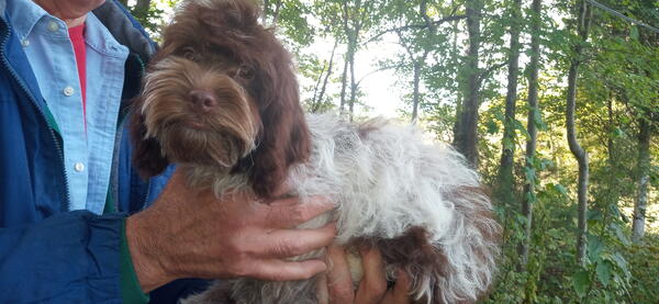 "Baki" Cock-a-Doodle-Do-PWD Choc/Wh. Male with ticking. Blend of Cocker -Poodle-Portuguese Water Dog. Dad 11 lbs Elizabeth, IN