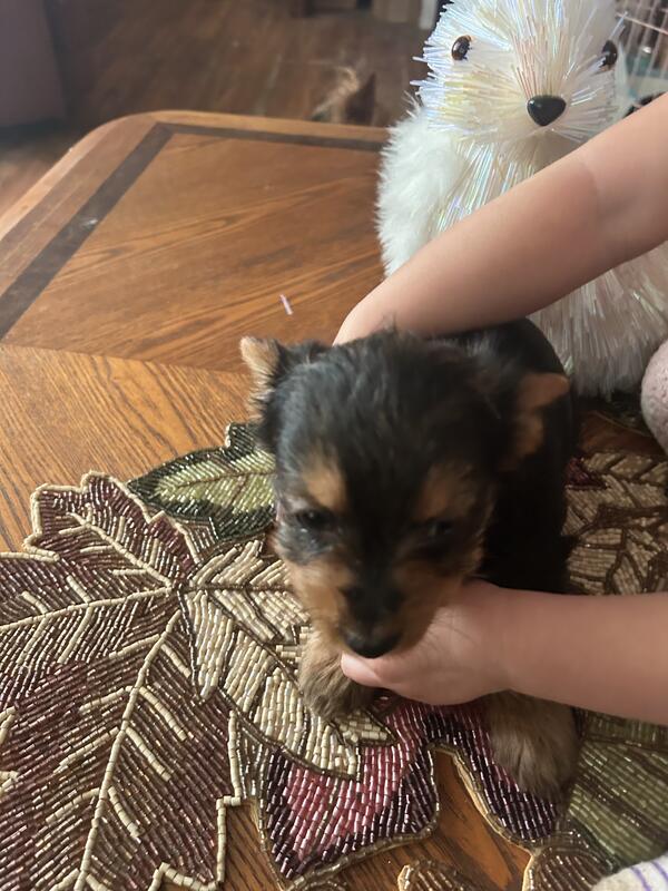 Black & tan 8 weeks old yorkies for sale. Vet checked twice, wormed, physical, tails decked. Dad & Mom are registered.