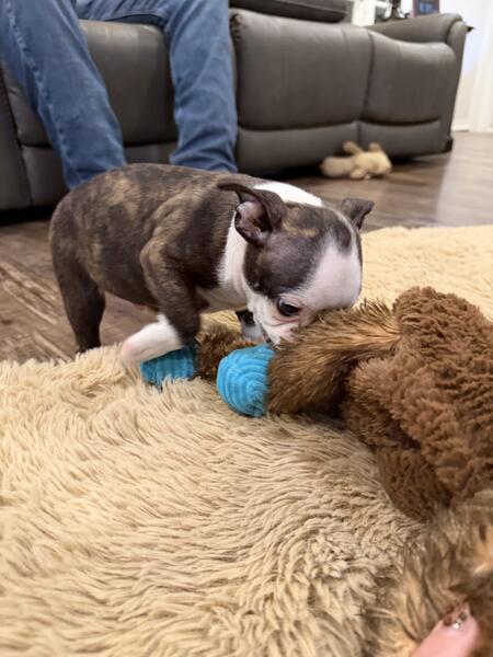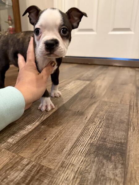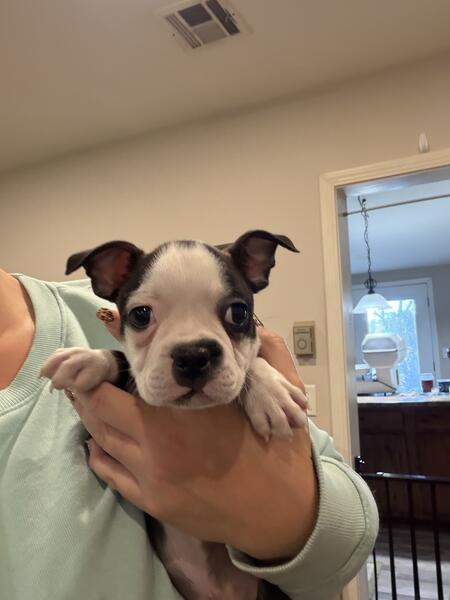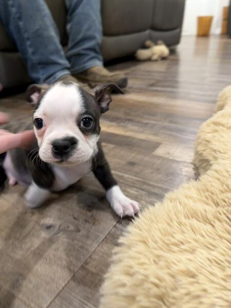 message pogle about this ad Handsome little AKC Boston Terrier puppy named Bono. He has a unique marking of a dot in the middle of his head. He is very cuddly and friendly right now. He was born 9/5/25. He will be ready to go to his new home by 10/31. He will come with registration papers, up to date vaccination record, vet check and limited guarantee. To reserve a puppy, we require us a $200 non-refundable deposit to hold. Delivery can be via pick-up or shipped. We usually can ship for around $300, we just need your zip code |