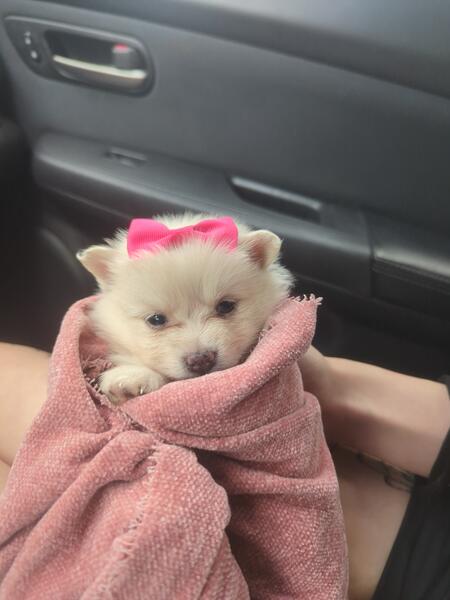 She is adorable. Still working on potty train. She's still a baby up to date on shots. Good with all other animals OBO