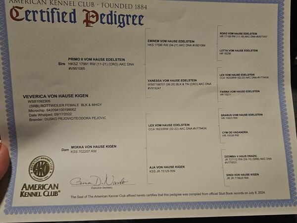 message genesisrotts about this ad I have a nice litter that will be born around Christmas time! Veve vh Kigen is a Serbian champion who produced nice dark mahogany pups last year. Orlando von Der Alten Festung is the son of Rudi vh Nuebrand III and he brings in a nice solid build with a big head. Great temperaments on both parents and always family raised. Pups will be AKC registered. Price is 2000 with limited akc or 2500 for full akc registration. Deposits are 500! I have 2 deposits currently on this litter 612 345 2484 call/text anytime |