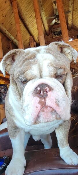 message fried about this ad 1 1/2 year old English Bulldog stud for service. Amazing personality and no health concerns. Gorgeous colors. Light tan/dark tan merle. |