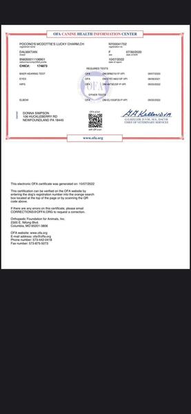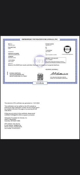 message pocono about this ad AKC registered Dalmatian puppies, health tested, 5 LUA 4 HUA, BAER tested good hearing. Mom is an AKC Champion. Puppies are well socialized with my children and are loved and played with daily. Puppies have been checked by a licensed vet, first shots, dewormed every 2 weeks, microchipped with AKC reunite. |