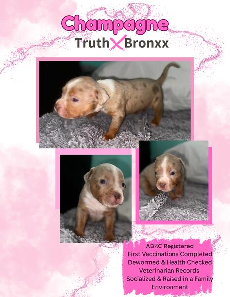message gamebred613 about this ad Meet Champagne *Pics of parents in post* This sweet girl is from our Truth Bronxx pairing and already showing off her confident, curious personality. Champagne is a beautiful Lilac Ghost Merle and has the sweetest temperamentshe loves to explore but also enjoys cuddles. Details: ABKC Registered First Vaccinations Completed Dewormed & Health Checked Comes with Veterinarian Records Socialized & Raised in a Loving Family Environment (More pictures/videos available on request Champagne is ready to join her forever family soon. If youre looking for a well-bred, healthy pup with both looks and personality, she could be the perfect fit. Message me directly for more info or to discuss availability. |