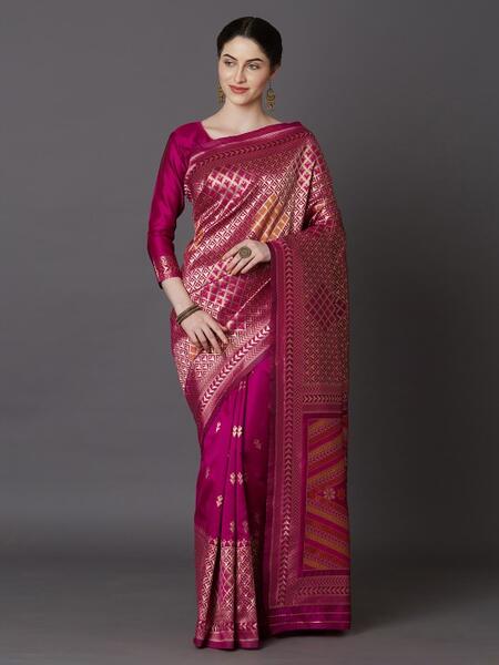 message rohinee about this ad Product Code: 11076698 Design Details: Magenta kanjeevaram woven design saree and has a zari border Blouse Piece The model is wearing a stitched version of the blouse piece. The saree comes with an unstitched blouse piece Origin: Kanjeevaram sarees are made in the Kanchipuram region in Tamil Nadu. The fabric bears the images of all the scriptures embossed on the walls of the temples of the Kanchipuram village. Length: 5.5 metres plus 0.8 metre blouse piece Width: 1.06 metres (approx) Feel stunning in this traditional saree from Mitera. This magenta design can be paired with an elegant pair of heels and minimalistic silver jewellery for your next family event. Saree fabric: silk blend Blouse fabric: silk blend Dry-clean httpsmyntr.it/ROsnRLs |