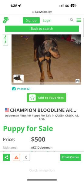 message jamesac about this ad AKC Doberman red male 1 1/2 yr old, papers, fixed, basic training, tail and dews done, natural ears. All up to date shots and de worming. Our puppy lineage is out of Champion bloodlines We have some exceptional puppies. Puppies are AKC, have wonderful temperaments, and are loving family protectors. Contact us for more pictures and info. Wonderful Champion Bloodline Puppy. Excellent health temperament and loyal protection with love. Will make the best family member. Contact us for available puppy information. Excellent health temperament and beauty. We strive to keep improving our lines. Vwd clear and more. Parent tests are done Eyes: certified C.E.R.F clear*Vwd: FreeThyroid function: OFA-certified normal Hips; OFA-certified EXCELLENT AKC Doberman Puppies AKC Champion Bloodline Health tested with Euro and American Champion lineage. Companion pet AKC registration papers. Contact us for more information. message jamesac about this ad |