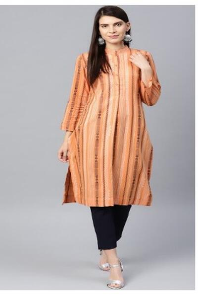 message rohinee about this ad Product Code: 10207171 Peach-Coloured and Navy Blue striped straight kurta with thread work and pleated detail, has a mandarin collar, three-quarter sleeves, button closure, straight hem, and side slits The model (height 5'8 is wearing a size S Comfortable and stylish, this kurta from W is ideal for any fashionista. Look chic for the day with this peach kurta and leggings. 75% cotton, 25% viscose Machine-wash httpsmyntr.it/ghsMtpK |
