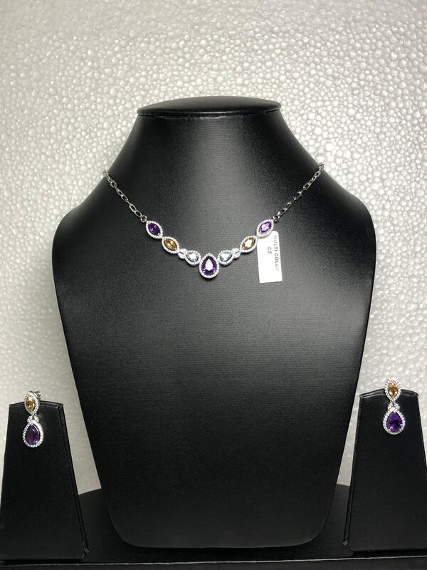 message beachychica about this ad Necklace and earrings in 925 silver with citrine, blue topaz and amethyst and zircon accents. 2 sets available call or text 305.988.3215 |