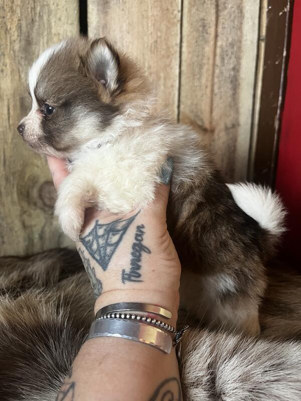 Will be 4-5 lbs as adults, chocolate sable male. Pet price $759 full AKC $1000