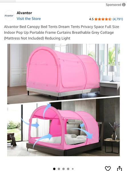 message deniseh about this ad Alvantor Bed Canopy Bed Tents Dream Tents Privacy Space Full Size Indoor Pop Up Portable Frame Curtains Breathable Grey Cottage (Mattress Not Included) Reducing Light Amazon's Choice Paid $116 New in bag |