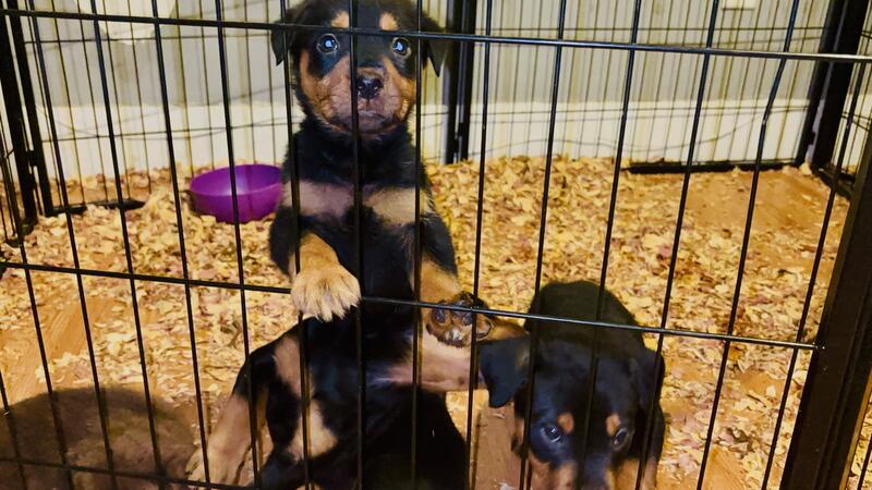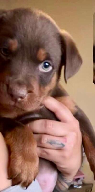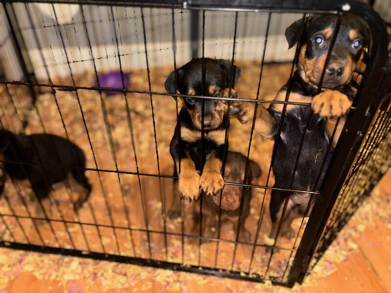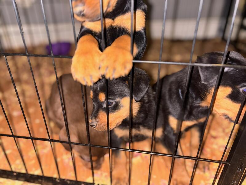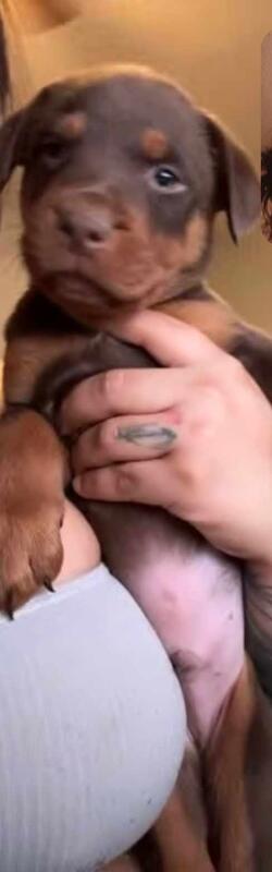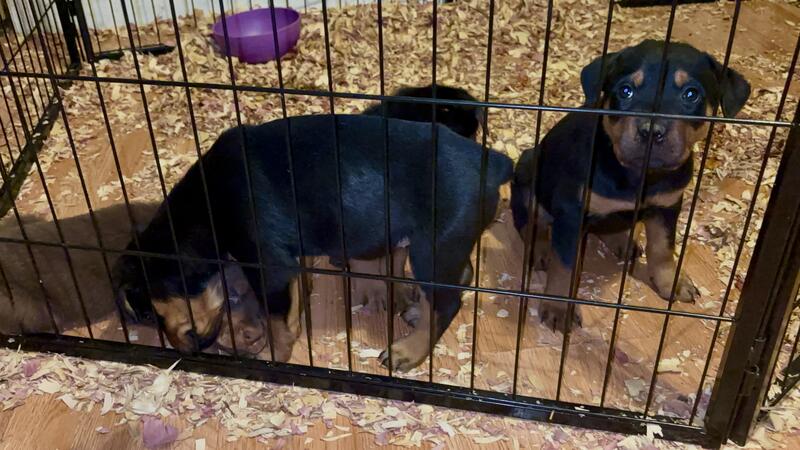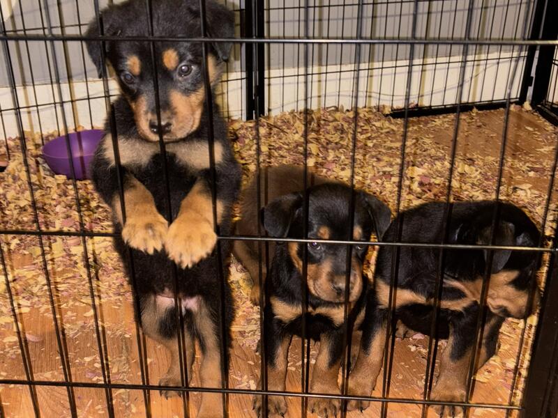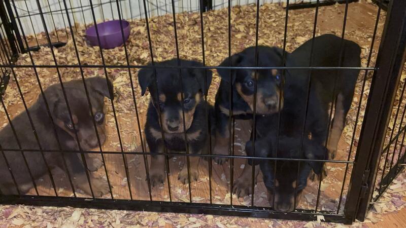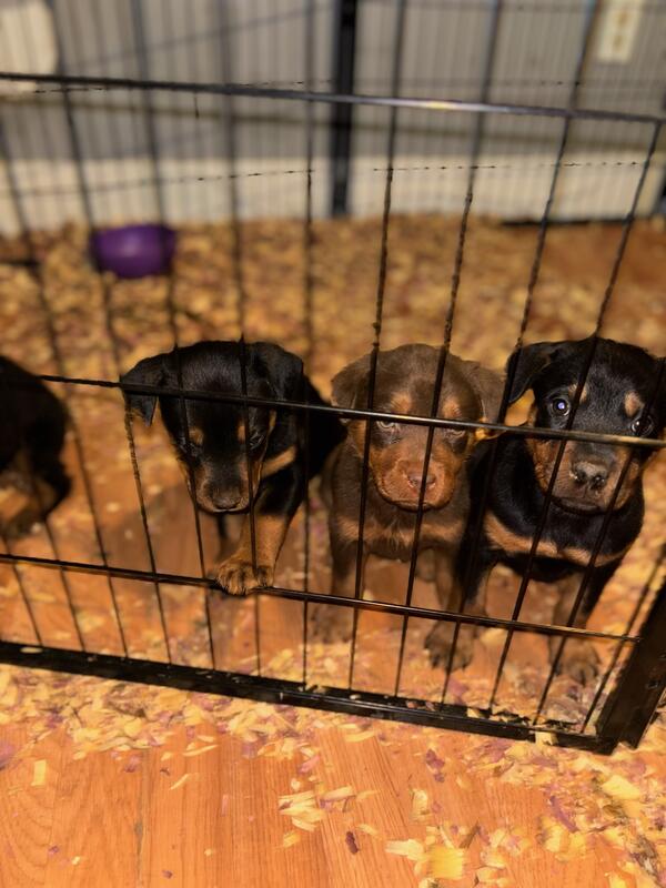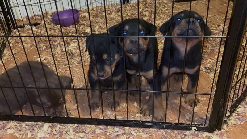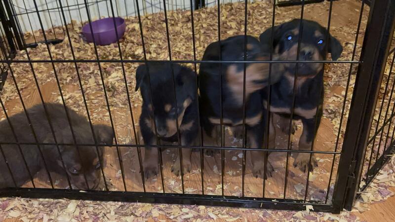 8 week old Rottweiler pups. Ready for their new furrever homes. Up to date on shots,dewormed and Tails have been docked. I have one male left and he will be the red rottweiler. These pups are pure bred. Both parents on site.