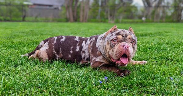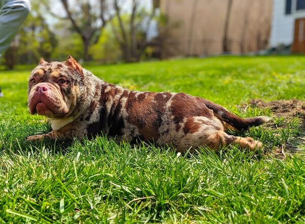 message lovebulldogs882 about this ad 1 1/2 years old merle female available for new home. She is ABR registered. House trained good with other dogs and children. No health problems. Located in Columbus Ohio.1500 with papers may consider trade for English bulldog pup. |
