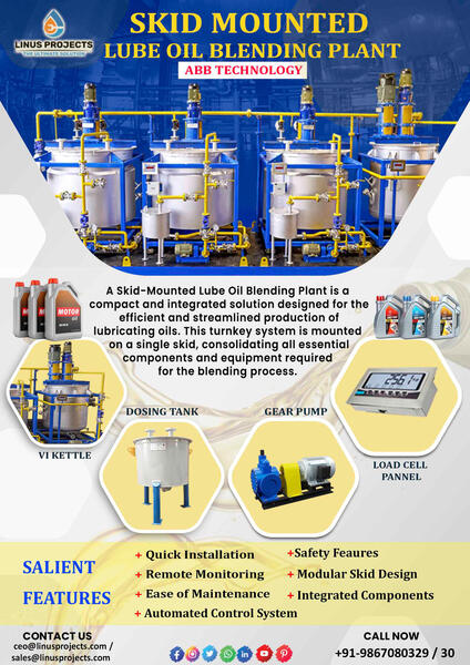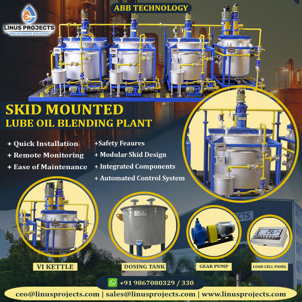 message smldnl2080 about this ad The Skid Based Lube Oil Blending Plant stands as a pinnacle of efficiency and innovation in the lubricant manufacturing industry. This state-of-the-art solution is meticulously designed to streamline the process of blending lube oils with precision and reliability. Mounted on a compact and modular skid, this plant offers a turnkey solution that optimizes space utilization, making it an ideal choice for industries where real estate is a critical consideration. Equipped with advanced automation, the skid-mounted blending plant minimizes the need for manual intervention. Intelligent sensors, programmable logic controllers (PLCs and user-friendly interfaces collaborate seamlessly to orchestrate the blending process with precision. This not only enhances the overall efficiency of the manufacturing process but also contributes to the production of consistently high-quality lubricants. The skid-mounted configuration offers additional advantages, simplifying installation and commissioning. The compact footprint allows for easy integration into existing facilities, reducing both time and costs associated with plant setup. This feature makes the skid-mounted lube oil blending plant an attractive choice for both new installations and facility upgrades. In terms of maintenance and scalability, the skid-mounted system excels. Routine maintenance is streamlined, ensuring minimal downtime and maximizing operational continuity. Moreover, the modular nature of the system facilitates easy scalability. Manufacturers can expand their production capacity by adding additional skids without major disruptions to ongoing operations. Whether deployed in the automotive, industrial, or aviation lubricant sectors, the Skid based lube oil blending plant offers a comprehensive solution for manufacturers seeking efficiency, flexibility, and reliability in their lubricant production processes. As a testament to technological advancements in the industry, this plant stands as a strategic investment, empowering manufacturers to meet market demands, maintain product quality, and stay at the forefront of the dynamic lubricant market. LINUS PROJECTS (INDIA) offers Innovative skid-mounted blending plant that minimizes the need for manual intervention. Intelligent sensors, programmable logic controllers (PLCs and user-friendly interfaces collaborate seamlessly to orchestrate the blending process with precision. LINUS PROJECTS (INDIA) Address: Plot No. N 86/3, Bohonoli Village, Opp CEAT Tyres, Anand Nagar Additional MIDC, Ambernath. Maharashtra 421506. LINUS PROJECTS LIMITED (NIGERIA) Address: KM 15, Phase II Plaza, Jakande 1st Gate, Lekki Epe Express Way, Beside FCMB Bank, Jakande Lekki Lagos State, Nigeria Mob: +91 - 9867080329 / 9867080330 Email: ceo@linusprojects.com sales@linusprojects.com message smldnl2080 about this ad |