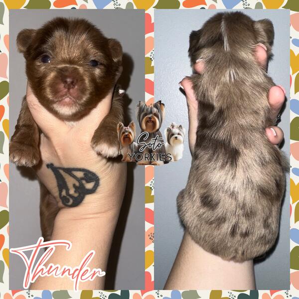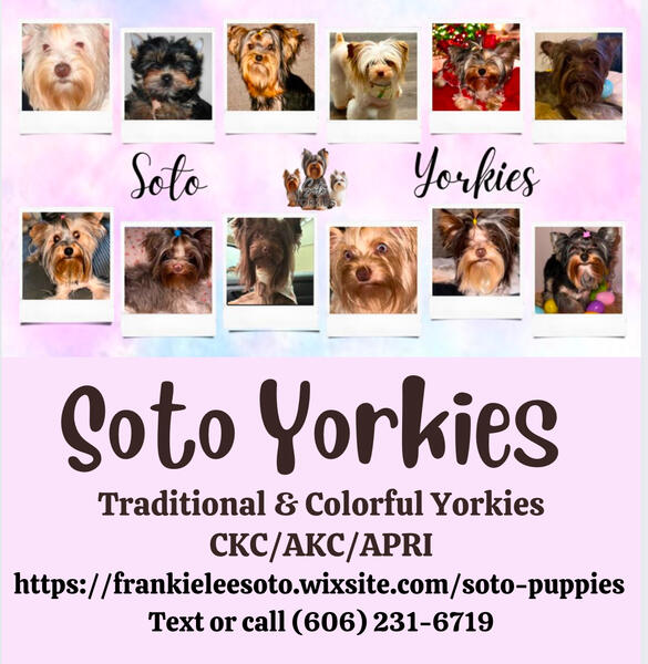 message frankielee09 about this ad We are hobby breeders located in London KY area. Our yorkies and pups are raised in our home. We breed pretty much every color yorkie there is. Pups come with genetic health guarantee up to 1 year of age against anything hereditary that is life threatening as well as a 48 business hour health guarantee against fatal viruses. We currently have a merle litter and some kb chocolate yorkies. We have a kb chocolate male runt, a bigger chocolate merle male and a chocolate parti merle male in one litter. We offer discounts for pet prices without registration but also offer registration and breeding rights for an additional cost. Please visit our facebook page to contact me or text me. Our puppies are also listed on our website with price information. Facebook: Soto Yorkies |