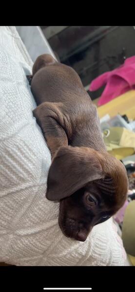 message bbnshl6281 about this ad She was born June 2nd she will be turning 4 months old. Unfortunately I cant keep her as I have to move where they dont accept pets. Shes still learning how to be potty trained she has her first set of shots. Really want her to go to a good home. Shes dachshund/cocker spaniel. Chocolate Brown with doberman look alike imprints. |