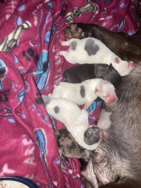 message carena722 about this ad He is a blue eyed blue pied Merle who is tri or blue and tan colored! Has a short back and can make solid Merles or pied Merles with correct female. He has phantom mark on his cheek and is proven! $1000 stud fee. |