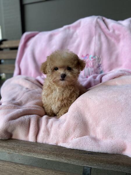message shihtzupups4me about this ad B E L L A Gorgeous Teacup Malti-Poo female puppy. Almost 2 lbs. age 10 weeks Pure white with light cream ears, brown eyes and black nose. Super affectionate and playful Silky soft curly hair Age-appropriate vaccines completed Hypoallergenic, excellent in a family setting Best for children 8 years and up |