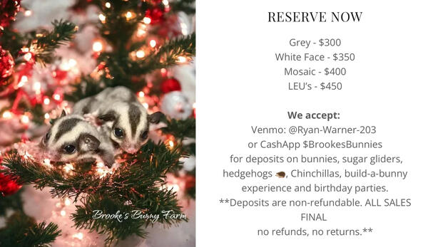 message brookesbunnies about this ad Its a beautiful hand raised baby Sugargliders available now we have all colors, including standard gray, leusistic, white face, and mosaic! Discounts for pairs Free bonding pouch and two month supply of food included with every sugar glider! 475-223-8818 |