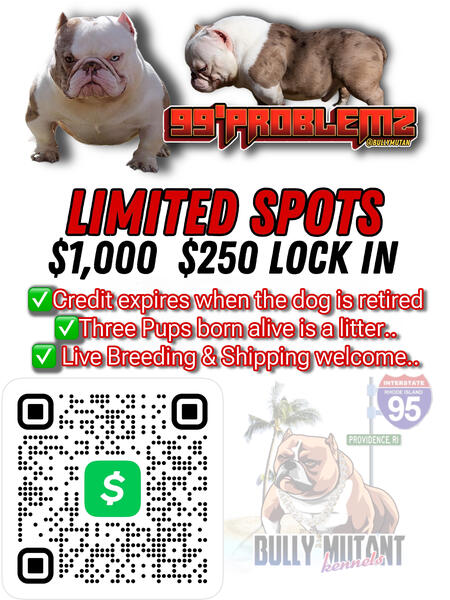 message bullymutan88 about this ad 99 Problemz, our stunning chocolate Merle stud! (working ) RHODE ISLAND ABR REGISTERED Limited Spots open @1k 250 lock ins 750 the day of breeding 99 Problemz is a Sherm son (with Sherm being a Forbes son) and his mother is a Fat Boy daughter. This boy is expertly bred to produce the perfect blend of strength and exotic flair. What I truly love about this bull, though, is how compact he is, boasting incredible body girth and a striking head. He truly is the complete package in a nano bull, highlighted by that gorgeous Merle coat. |