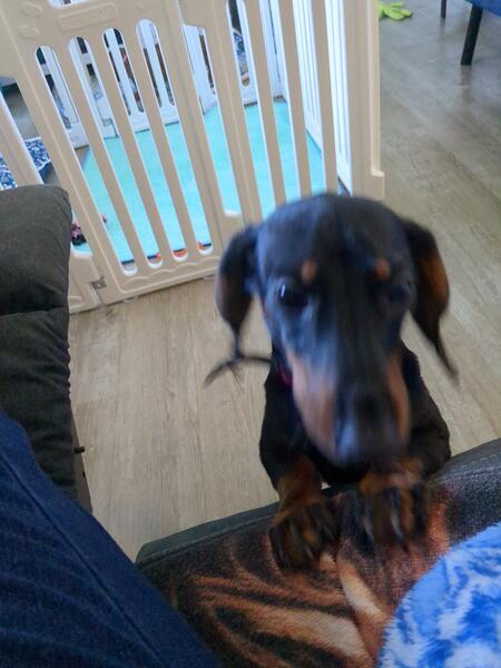 message mmgmlc1767 about this ad Mini Dachshund. Born 2/24 Black and tan smooth hair. Male. All shots are UTD. Kennel and pee pad trained. Working on outside. Doing well.Good with small dogs Text 7725880594 |