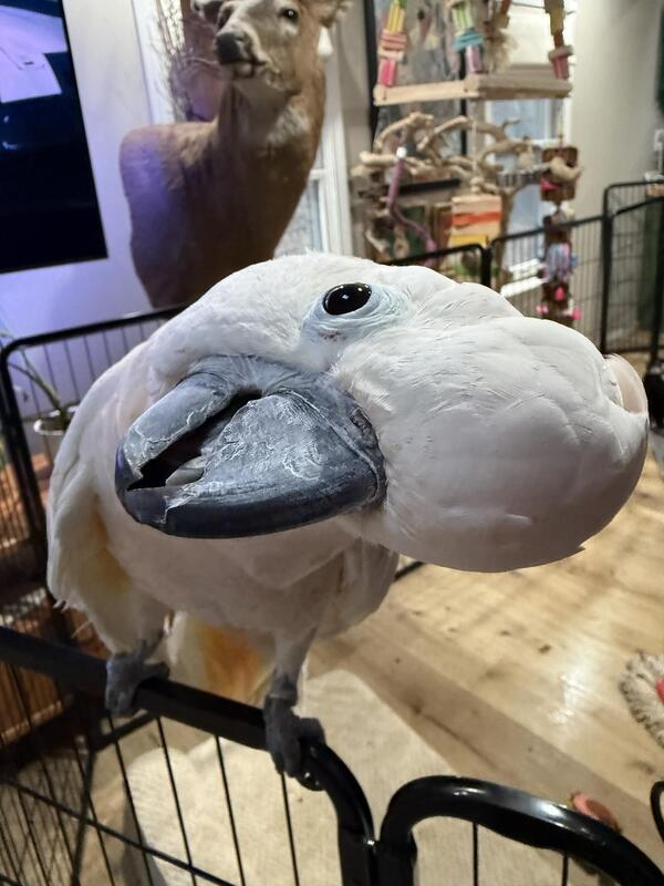 message bygoodgracemas about this ad Moluccan cockatoo female. She does talk (hello, pretty girl, go outside, I love you, mom come back etc Very quiet for a moluccan. She loves everyone! Loves to go for car rides and out of the house to meet people. Has never bitten, she is truly a one in a million cockatoo. She lives cage free on a playstand set up, used to children and dogs. She will not fly (arthritis from years of being locked in a cage prior to coming to me Estimated age in early 30s. |