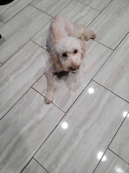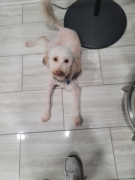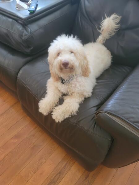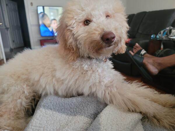 Nine mo old Goldendoodle house and crate trained. 4 weeks obedience training. Loves to play good with children.