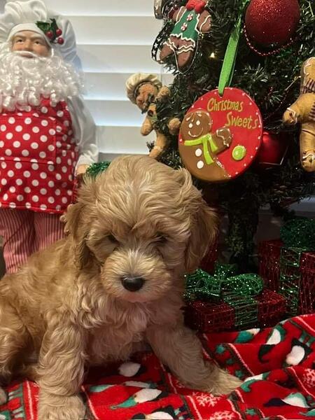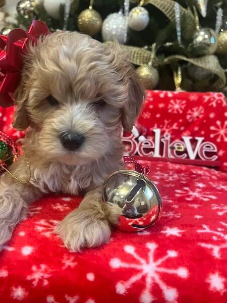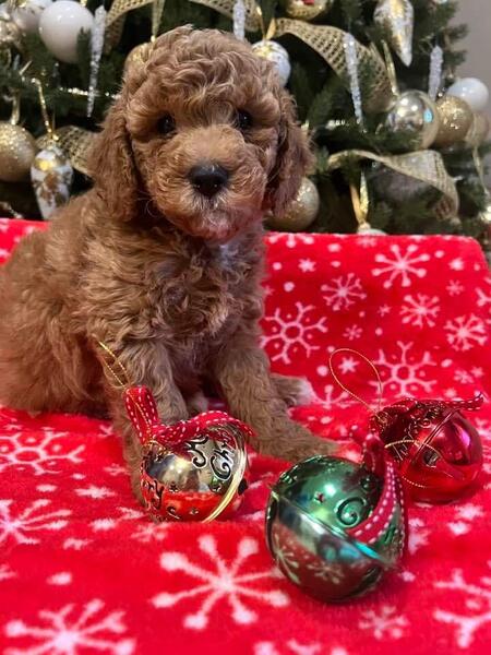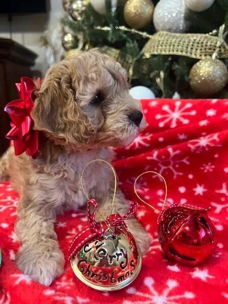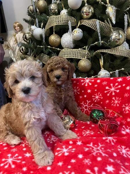 message daisyharts about this ad Adorable F1BB Minature Golden Doodle Puppies Ready now. 4 males, 1 female. Mother is a Mini Golden Doodle and weighs 23.4 lbs, Dad is a white poodle and weighs 15 lbs. Currently 7 wks, will be vet checked, dewormed and current on vaccines. Just In time for Christmas Near Muncie, Indiana 2 male puppies left. One is dark brown, the other is tan and white |