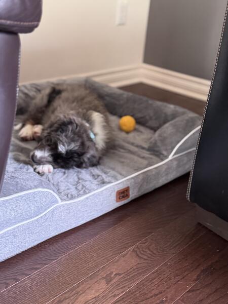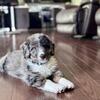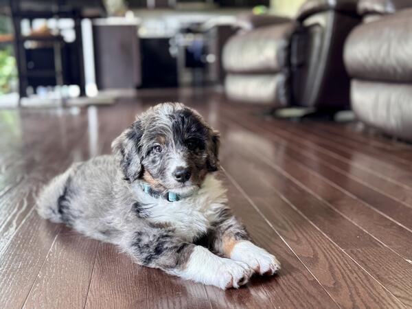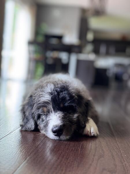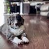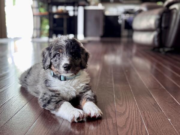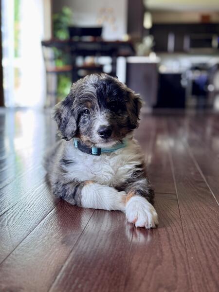 message shobana about this ad Breed: Leo is a tricolor merle male bernedoodle puppy. This means he's a mix of Bernese Mountain Dog and Poodle. Appearance: He has unique facial markings that are expected to become more striking with age. He is also described as a bold and handsome tricolor merle male. Personality: Leo is full of energy, loves to play and snuggle, and isn't shy about asking for attention. He is considered a "bold, outgoing, and utterly stunning pup Size: Leo is the largest puppy in his litter and is expected to reach 65 pounds. Lineage: His mother is Violet, an AKC Bernese Mountain Dog, and his father is Rocko, a CKC miniature merle poodle. Rocko is OFA certified. |