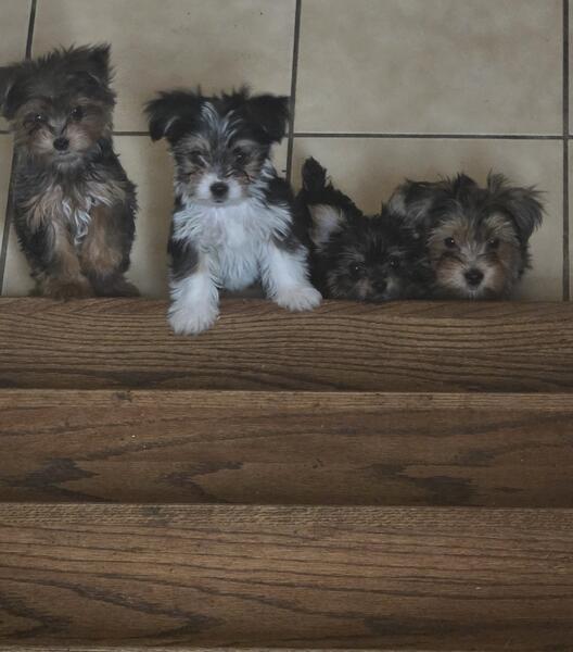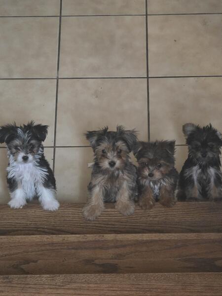 message yorkiemomaz about this ad 1 traditional black and tan female charting 2-4 pounds grown 1 party male charting 4-6 pounds grown 1 merle female with blue eyes charting 2-4 pounds grown 1 merle male charting 5-8 pounds grown Puppies are potty trained on washable potty pads, kennel trained and playpin trained. Familiar with car rides, baths and grooming Mom is a 6lb black and tan yorkie Dad is a 4lb merle yorkie In person meetings can be arranged upon request to serious families. We have payment plans available if needed with a signed contract. Please text me at 9286107766 for more information |