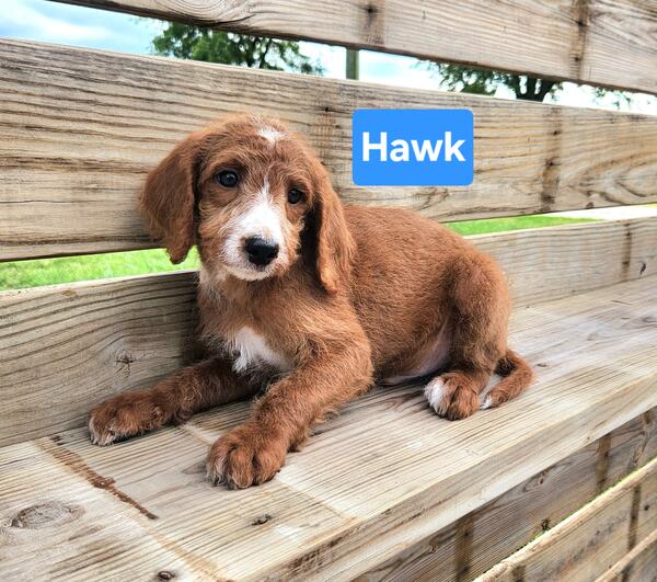 message stormyacres about this ad A deposit of 200 holds a puppy with the rest due at time of pick-up. Hawk will be priced at 800 since he will have a straighter coat and shed some. Mini Labradoodles about 25 to 35 lbs, low-shedding, vet checked with the first round of shots, dew claws removed, and dewormed. We start with crate training and potty training, well socialized with people and other dogs. We give them their 1st grooming before they leave. They are a 3rd generation labradoodle born & raised in our home in Remington IN. Parents have been health tested, and the puppy comes with a 1-year health guarantee. They can go home August 14th. |