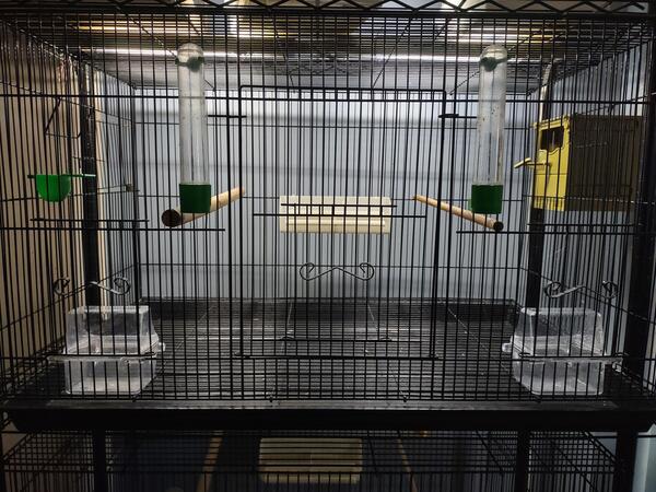 message tentiu about this ad I have four (4) 30w x 18d x 18h bird cages. $55 each. Large and small doors for easy access. Spring nest door + second added nest door (in case you want to add another nest or keep 2 pairs Pull out plastic tray for easy cleaning. Includes 2 seed cups, 2 water tubes, 2 perches, 1 plastic finch nest, 1 treat cup and 1 large seed dish with perch, Cash only. Everything you need, just bring the birds |