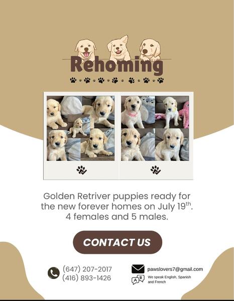 message pawlover about this ad Adorable Golden Retrievers puppies ready for the new forever homes on July 19th, 2025 3 females : pink, yellow and purple and 5 males: grey, black, brown, blue and green Are available. Golden Retrievers are known for their cheerful and friendly personality, making them beloved family pets. They are intelligent, eager to please, and generally gentle, both with children and other animals. Dad and Mom are both purebred family-owned Golden Retrievers. Your adorable new pet will come home with the following: Official vet-check pamphlet (1st set of vaccination, de-worming and microchip) puppy health. Already vaccinated on July 2. All puppies in good health A toy, collar, blanket and a bag of dog food Questionnaire will be sent to help get you started with your new furry friend! FaceTime/ photos and videos can be request so you can choose your dog. Meetings are allowed now! Official deposit will guarantee your choice of the litter! A non-refundable deposit of $500 is required to guarantee your puppy For any questions: Pawslovers7@gmail.com (647) 207-2017 or (416) 893-1426 We speak English, Spanish and French message pawlover about this ad |