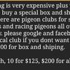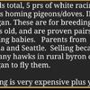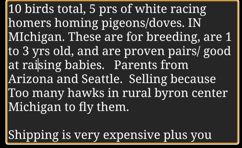 message pigeonsgr about this ad I have 5 proven pairs of white racing homers. They are all from 1.5 yr to 2.5 yrs old and proven good parents. There are too many hawks in rural byron center michigan to fly their young so im quitting. I go between byron center michigan and kalamazoo michigan a lot including weekends. $ 50 a pair. $175 for all 4 pairs. Shipping is very expensive plus you need to buy a special box and ship it to me. There are pigeon clubs for show pigeons and racing pigeons all over the country. please google and facebook your local club if you dont want to pay over $100 for box and shiping. |