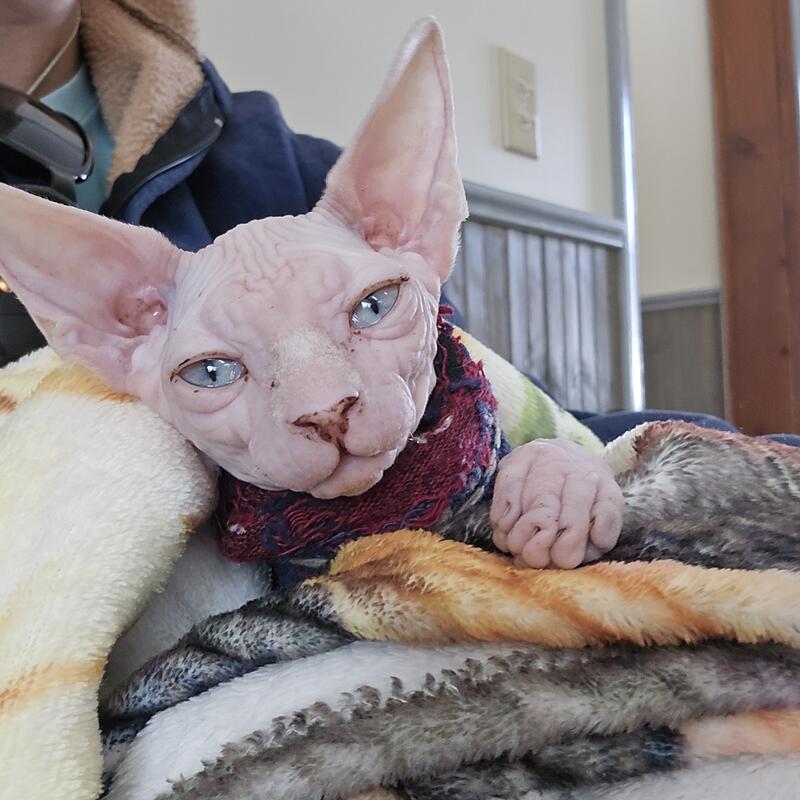 message hilaryjay about this ad Born november 3rd so hes 4 months old hairless spynx very very nice boy was bottle fed since day 1 absolutly loves attention from everyone great with kids used to afes 3 an 5 yeqr olds .Litter trained great with dogs and other cats. U can contact 585-808-7590 for faster response.hes been vet checked many times an has all his shots up to date including rabies and also wormed many times. |