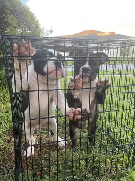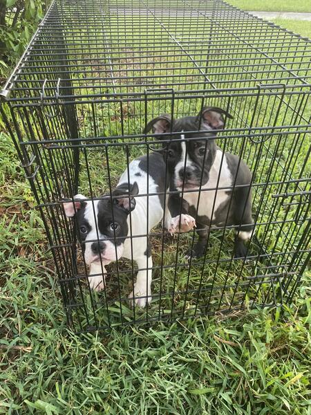message bsbnc555 about this ad Exotic Bully Male is the predominantly white one. Female is the predominantly black one. They are super sweet and spunky They both love fighting the mop, so adorable! These babies are available now with or without papers if youd like to save a little money on the fee. $375 no papers $2,200 papers available at any time after purchase as add on. Pure Exotic Bully, quiet breathers! Crate trained and now being leash trained. LOCAL PICKUP ONLY Hunters Creek. Thank you |
