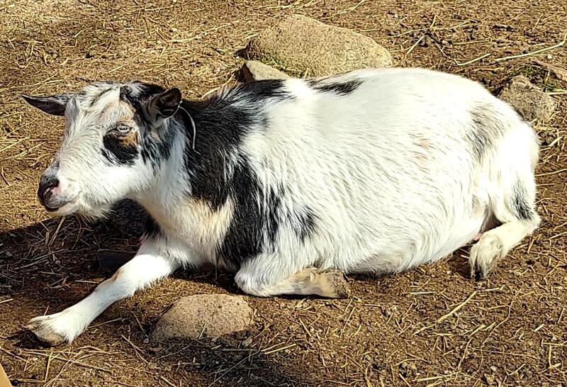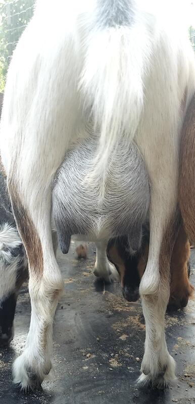 message jazzygirl66 about this ad - Cookie, Registered, 2021 born, blue eyed/moonspotted/flashy looking, Nigerian Dwarf Doe, in milk one buck available in another post is one of her April 2025 twins. She has a nice udder she is just over height for shows Pictures are of her pregnancy udder, udder in August with her daughter nursing on her, and of her just chilling in the sun before she kidded |