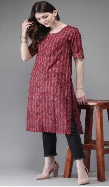 message prerana about this ad Product Code: 10297669 Red and Blue printed straight kurta, has a round neck, three-quarter sleeves, straight hem, and side slits The model (height 5'8 is wearing a size S You'll love the elegant design and fit of this stunning kurta from Anouk. Dress up for your next family event by pairing this red piece with your best Kolhapuris and simple jewellery. 100% Cotton Machine-wash httpsmyntr.it/baj5pSX |