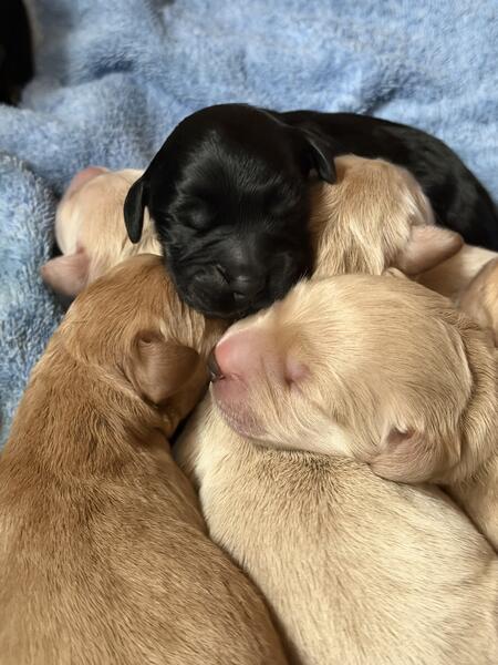 message a1w4ys about this ad Goldendoodle Retrievers HAVE ARRIVED! (HEALTH TESTED PARENTS) DOB: 11/20/25 Girls: 2 black, 1 white w/silver Boys: 1 red, 3 champagne, 1 white. Sire: Goldendoodle, CGC title, 65 pounds, poodle-like fur that is easy to groom and sheds very little, low energy (couch potato) Health tested via Embark. Dam: Labrador, 75 pounds, Lab-like fur, low energy (also a couch potato gentle personality. Embark tested! Pups are expected to have coats ranging from Lab-like to wavy/curly. Lower shedding expected but not hypoallergenic. Pups are expected to be large, gentle, easy to train, and great family, therapy, or service dogs! Pups come vet checked, started on crate training, and exposed to various stimuli. They will be raised indoors as family and started on housebreaking. They will be exposed to chickens THIS IS A ONE TIME BREEDING BEFORE THE SIRE IS FIXED! |