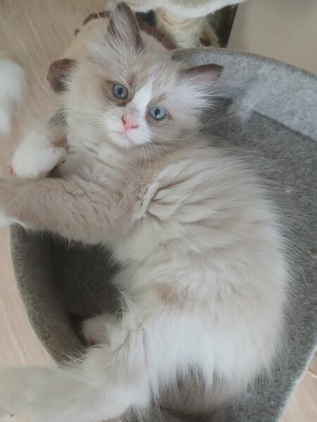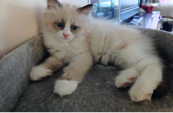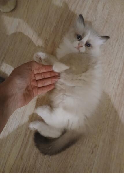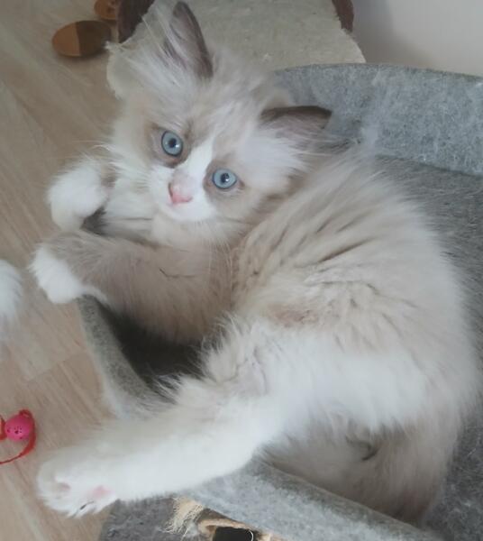 The kitten was born on 06/17/25. He eats a kitten food and uses a litter box. Very curious, playful and happy boy.