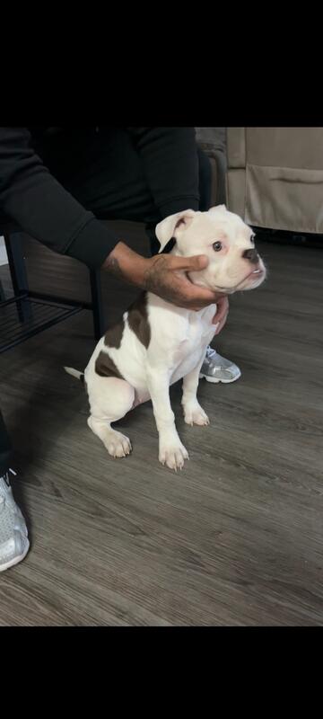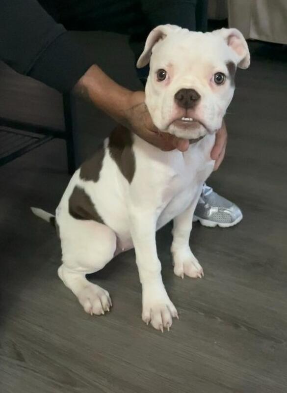 4 months old female bulldog with all vaccinations and dewormed for small rehoming fee 100 mom and dad in pictures