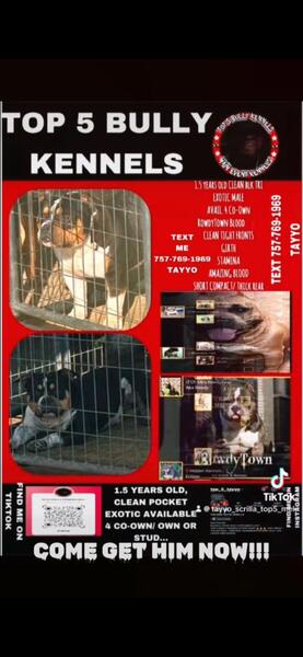message maineventkennel about this ad 1.5 YEAR OLD MALE STUD FERTILE LOOKING FOR NEW HOME OR CO-OWN CLEAN POCKET PERFECT HYBRID EXACT POCKET HEIGHT HMU 757-769-1969 TAYYO VERY FERTILE BLACK TRI MALE PROVEN PRODUCER DAD IS A WORLD CHAMPION IN SEVERAL REGISTRIES HEAVY HITTER BLOODLINE YOUR CHANCE TO ADD THIS TO YOUR CAMP FULL RIGHT WITH ABKC PAPERS 500.00 CO-OWN 300.00 PREFERRED NO PAPERS PET HOME 250.00 STUD-USE: 250.00 WITH PUP-BACK TO APPROVED FEMALES ONLY |