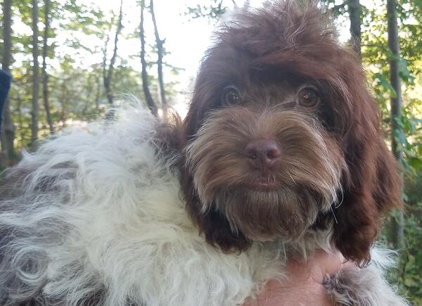 message u2jereo2 about this ad "Bacon" Poodle - PWD- Cock-a-Doodle-Do Choc/White Small Male with chocolate ticking Blend of Poodle Portuguese Water Dog & Cocker Spaniel. Dad 11 lbs. Elizabeth, IN |