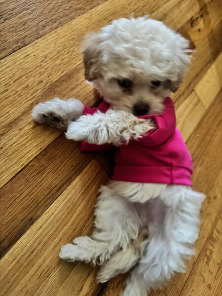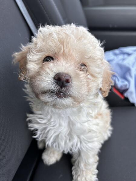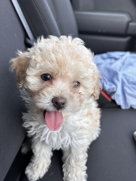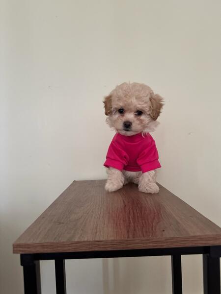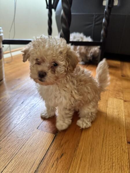Female, cream colored Malti-poo puppy. Last one left in the litter. Dewormed and first shots. She is adorable.
