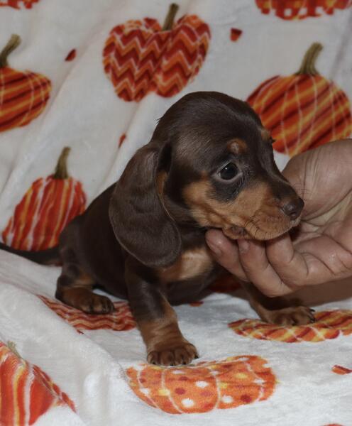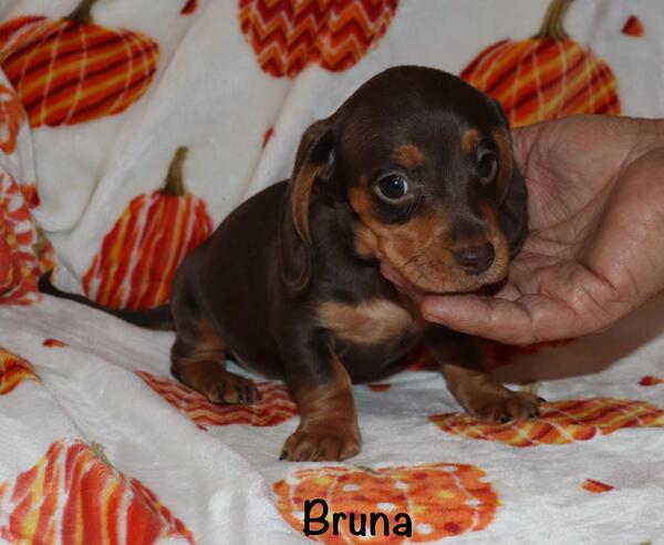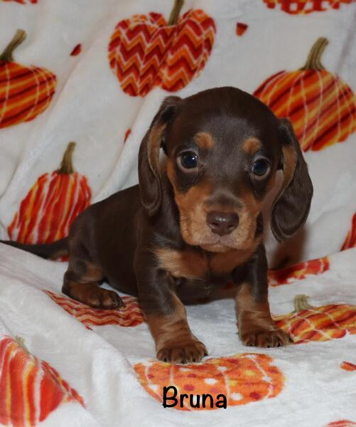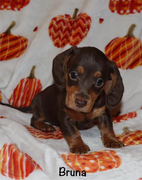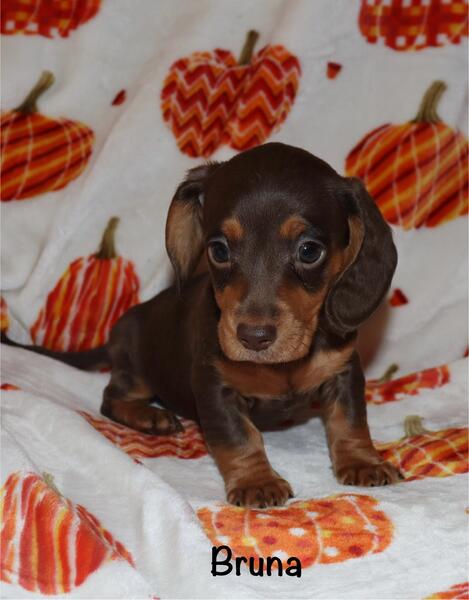 message uttspoodles about this ad Bruna is a chocolate and tan miniature dachshund. Her parents are 9 and 11 lbs. she will be up on her shots and deworming when she leaves here. DOB is 9/25/25 |