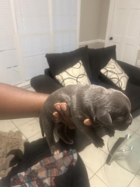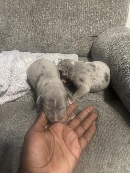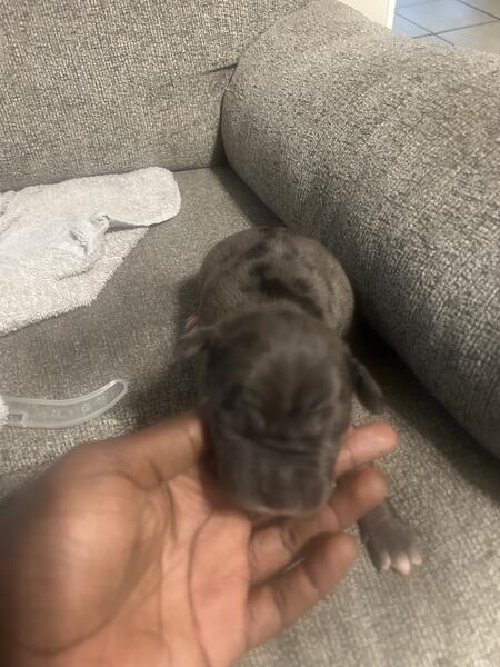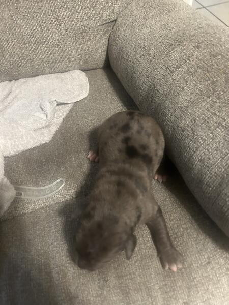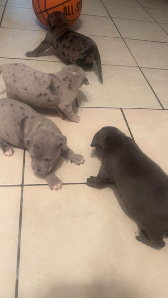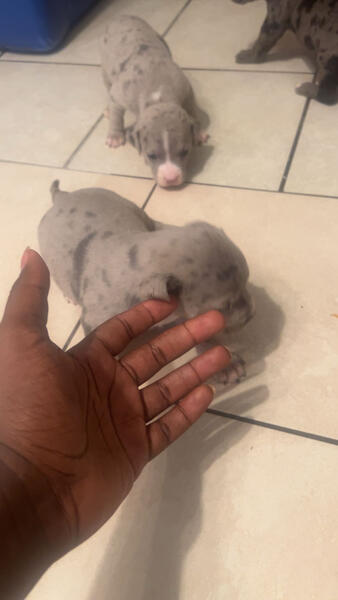 message kingslim901 about this ad I have 6 puppies all girls, three Merles. And two blacks with white chest. One blue/gray girl available. Mom is a chocolate Merle and dad is a blue xl bully. They will be three weeks old this week. Merles 400, blue 300 and black 250 |
