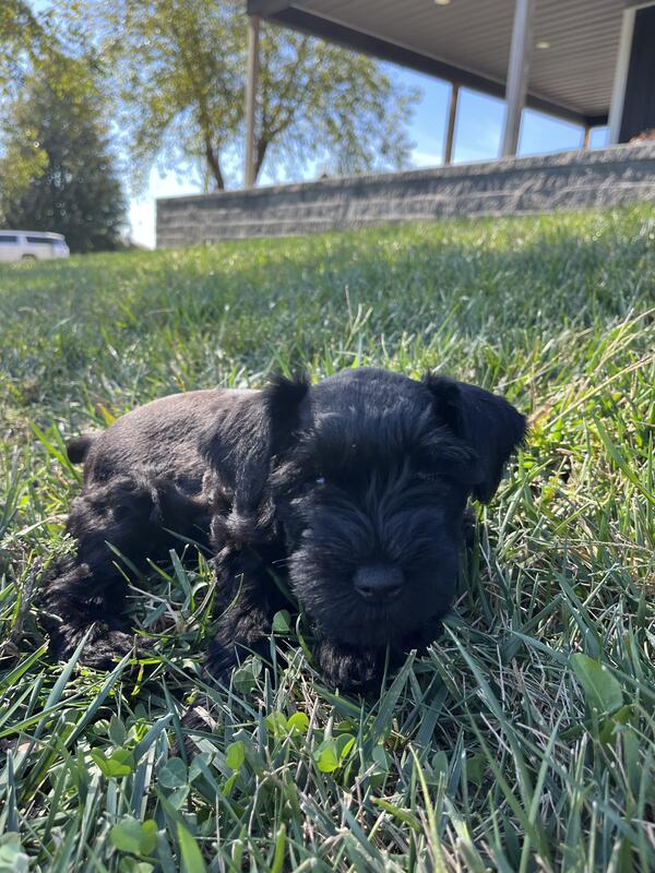 message kendranl about this ad Black Mini Schnauzer puppies for sale. We had a litter of 7 puppies and 4 left to find their homes. AKC registered pups, all black, 2 Males and 2 Females. One of the Females has a little white on her feet and her beard. They have had their shots and been dewormed tails docked and dew claws removed. They will be ready to go October 8th! Mom and Dad are both 13-15 lbs. |