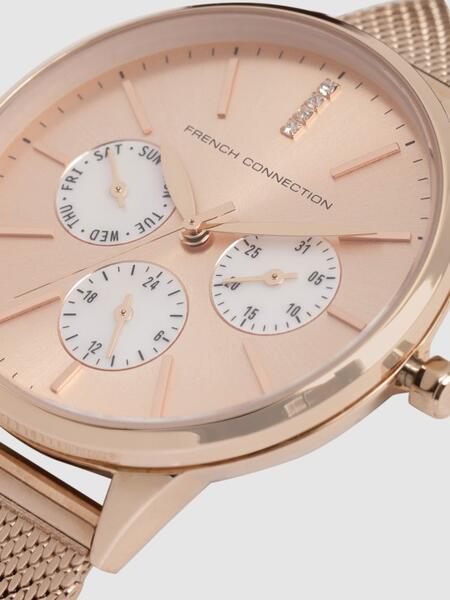 message rohinee about this ad Product Code: 12360836 Display: Analogue Movement: Quartz Power source: Battery Dial style: Solid round stainless steel dial Features: Reset Time, Date Aperture, Calendar Strap style: Rose Gold-Toned bracelet style, stainless steel strap with a foldover closure Water resistance: 30 m Warranty: 1 year Warranty provided by brand/manufacturer Comes in a signature French Connection case httpsmyntr.it/yDA3rlWf |