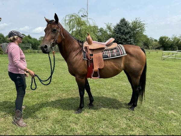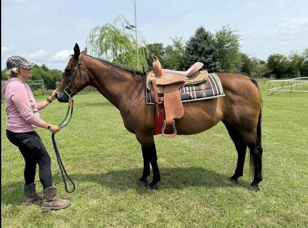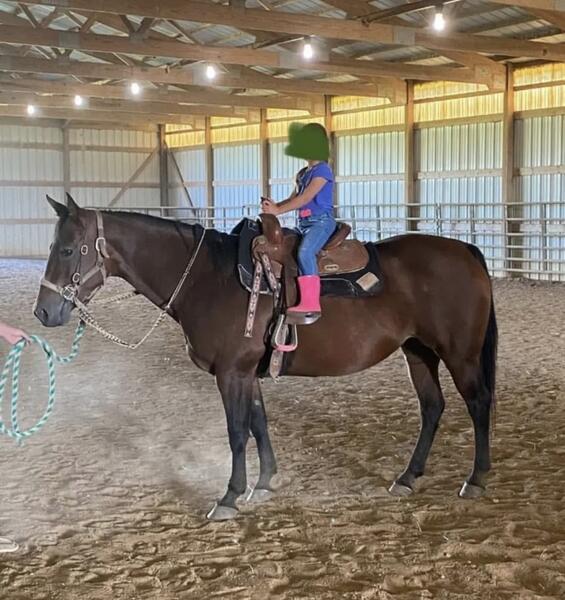 message englishgoldens123 about this ad Quarter horse mare, 14 years old. Healthy. She gets along with other horses, goats, ponies, donkeys and chickens. She is for experienced or confident riders. She is excellent with children we have lead our kids around on her. She went to a month long training to find out she is perfect (it owner error) a couple years ago. She is truly a great horse BUT has been sitting for going on 2 years and is now being more distant, so is currently being a little stubborn to catch. She has had a few extra training sessions after her training which she did with excellence. She does great as long as you are not fearful. If you have fear it makes her nervous, so this is why she would do best with a confident rider She loves to eat treats from your hand! She is easy to saddle up, and load up in a trailer. Ties, and trims easy. She is muscular and built very nice! She has a gorgeous thick winter coat in the winter. She LOVES kids! Trainer said she does great on trail rides riding front and back! A little spook if she isnt worked with for a while. She may do a small buck at first since its been a while since ridden but then typically wont do it again. But if worked with often she is perfect! Urbana OH Open to partial or whole trades for Nigerian dwarf goats, Jenny donkeys, friendly rideable pony, or smaller kid and grandma safe gelding that is the same even if not worked with for long periods of time. message englishgoldens123 about this ad |